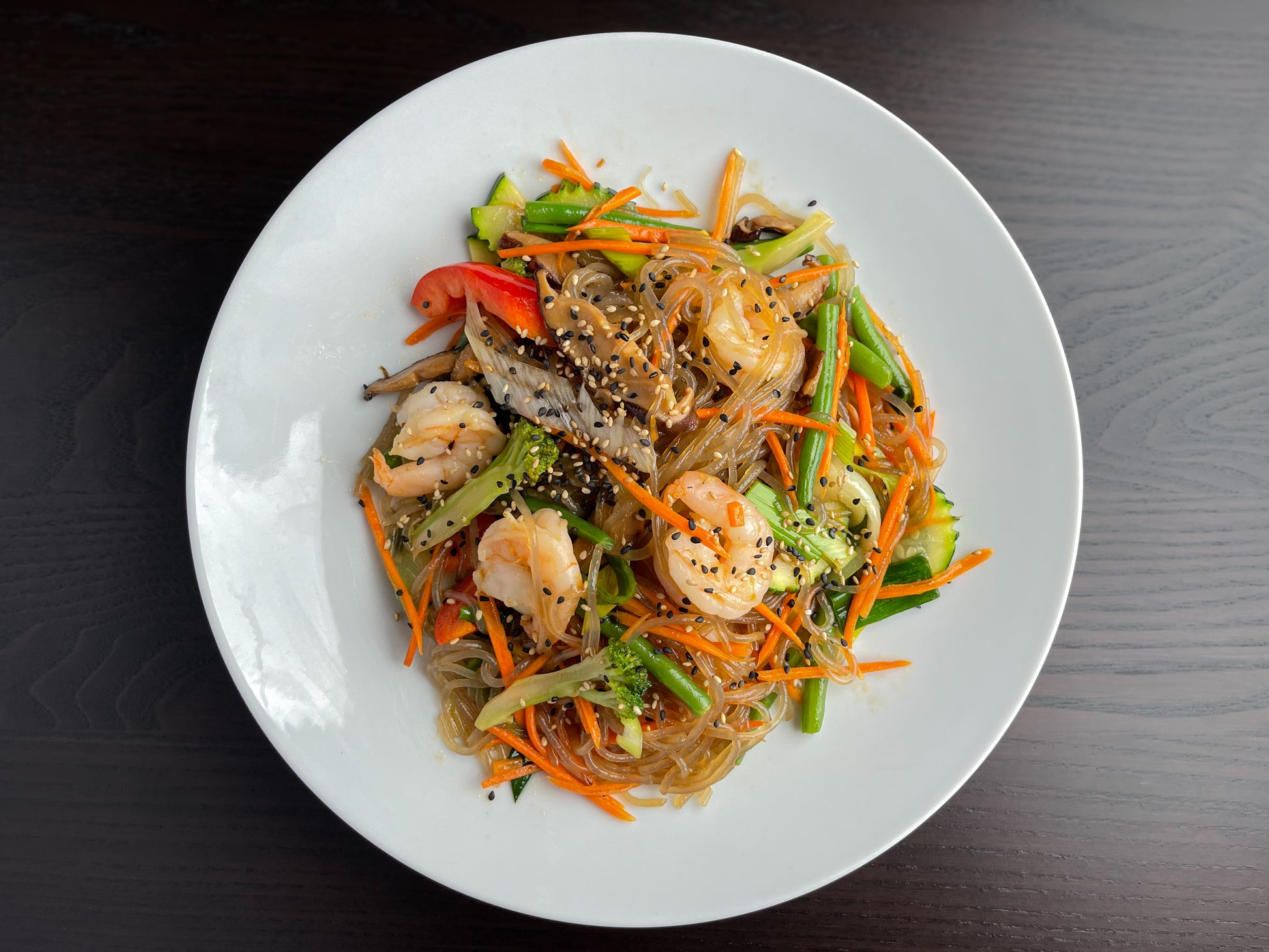 Koreanische Glasnudeln mit verschiedenem Gemüse und Garnelen.