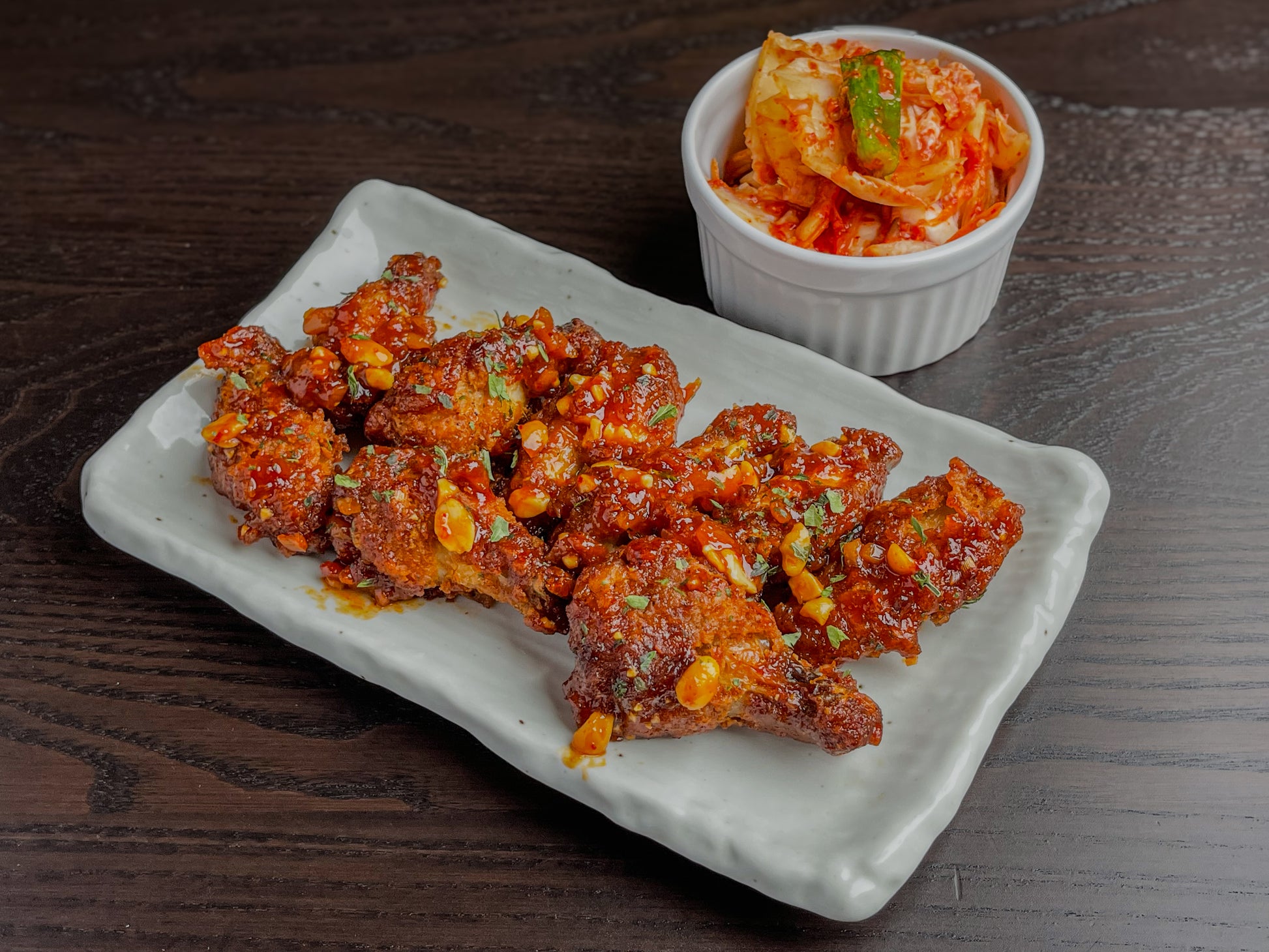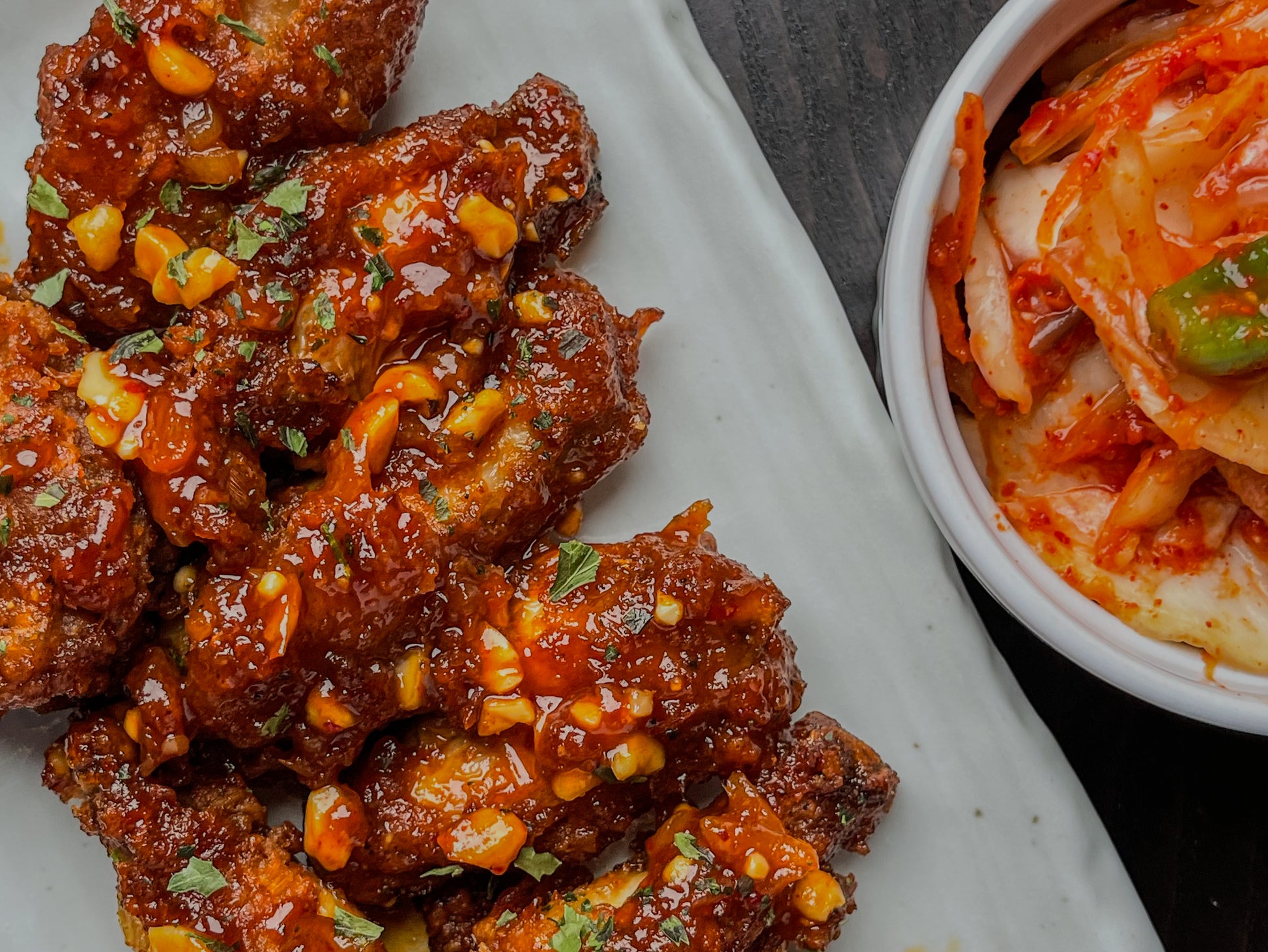 Nicht nur wir lieben es, auch die Kimbu-Fans lieben Korean Fried Chicken. Glasiert in einer speziellen Marinade und serviert mit hausgemachtem Kimchi.