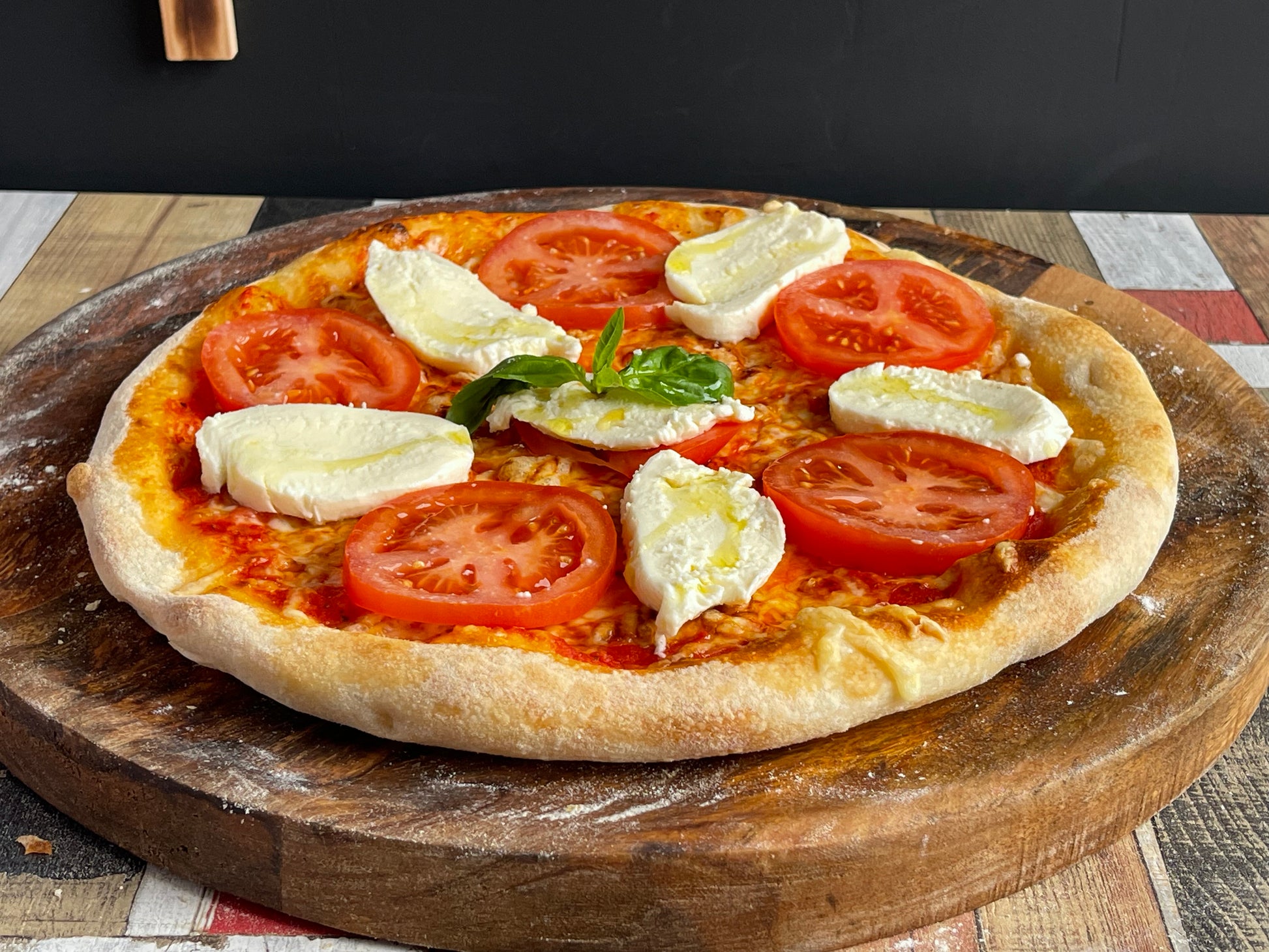 Tomatensauce, Mozzarella , Tomaten u. Mozzarella in Scheiben, Basilikum